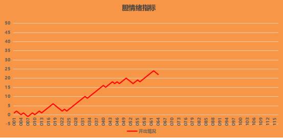 图中显示的是三胆的情绪指标趋势图,图中显示折线出现了连续调整,昨天说过了一个调整还不能判断顶部结构,现在出现了连续调整,这个时候顶部信号概率增大,这个阶段多看少动,切勿激进。