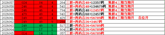 065期开出了057组六形态,组六还是继续走连续上升趋势行情,组三继续走大遗漏中。昨天三胆终结了两连阴出现了止跌,这个位置是否能延续反弹呢?目前还需要继续观察才行。昨天三胆开出一个,胆合跨组合开出。最近跨合的组合出现了连开行情,现在已经是5连阳了,趋势上来看强者恒强,目前当期组号的方式还是围绕胆合跨来看,之前组号都是胆合跨单独看然后再组,不好看整体的趋势性行情,近期打算做一个合跨的指标趋势,这样通过合跨组合的联动,趋势就更容易判断冷温热。