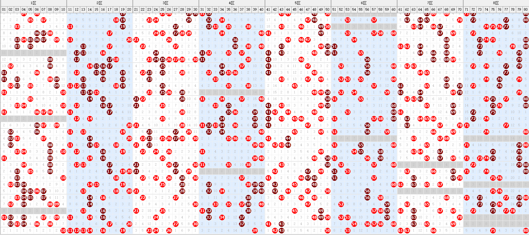 上图中把80个号码分成4个区间,每一个区间段都是20个号码,第一区01-20这个区间昨天开出了7个,第二区21-40开出了4个,第三区41-60开出了4个,第四区61-80开出了5个。四个区的号码个数比例:7:4:4:5。
