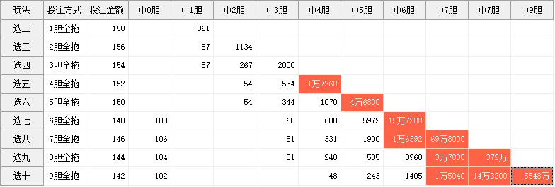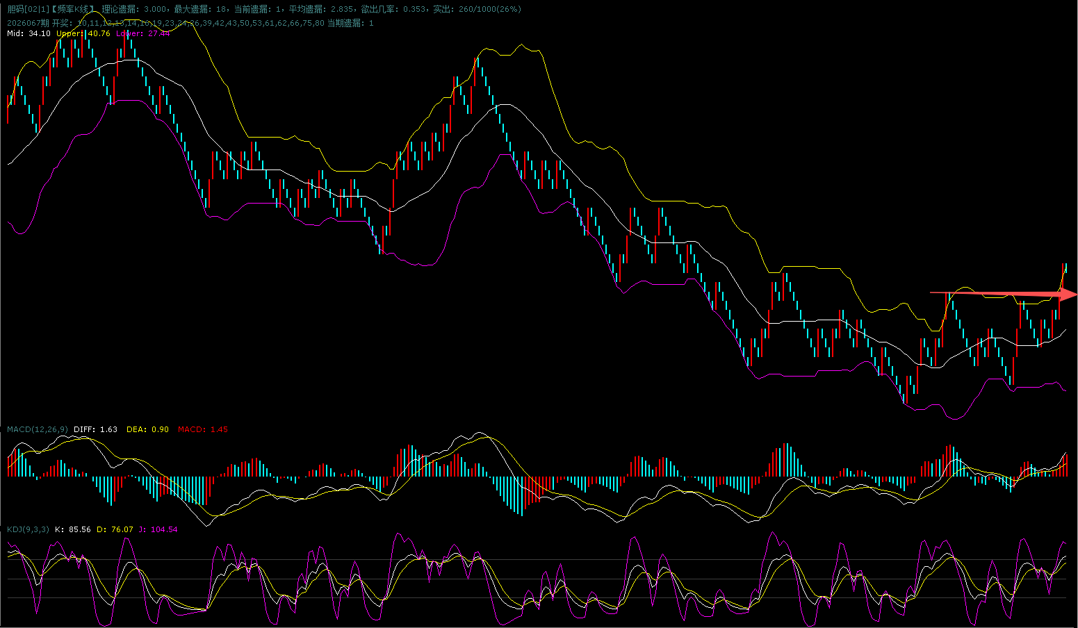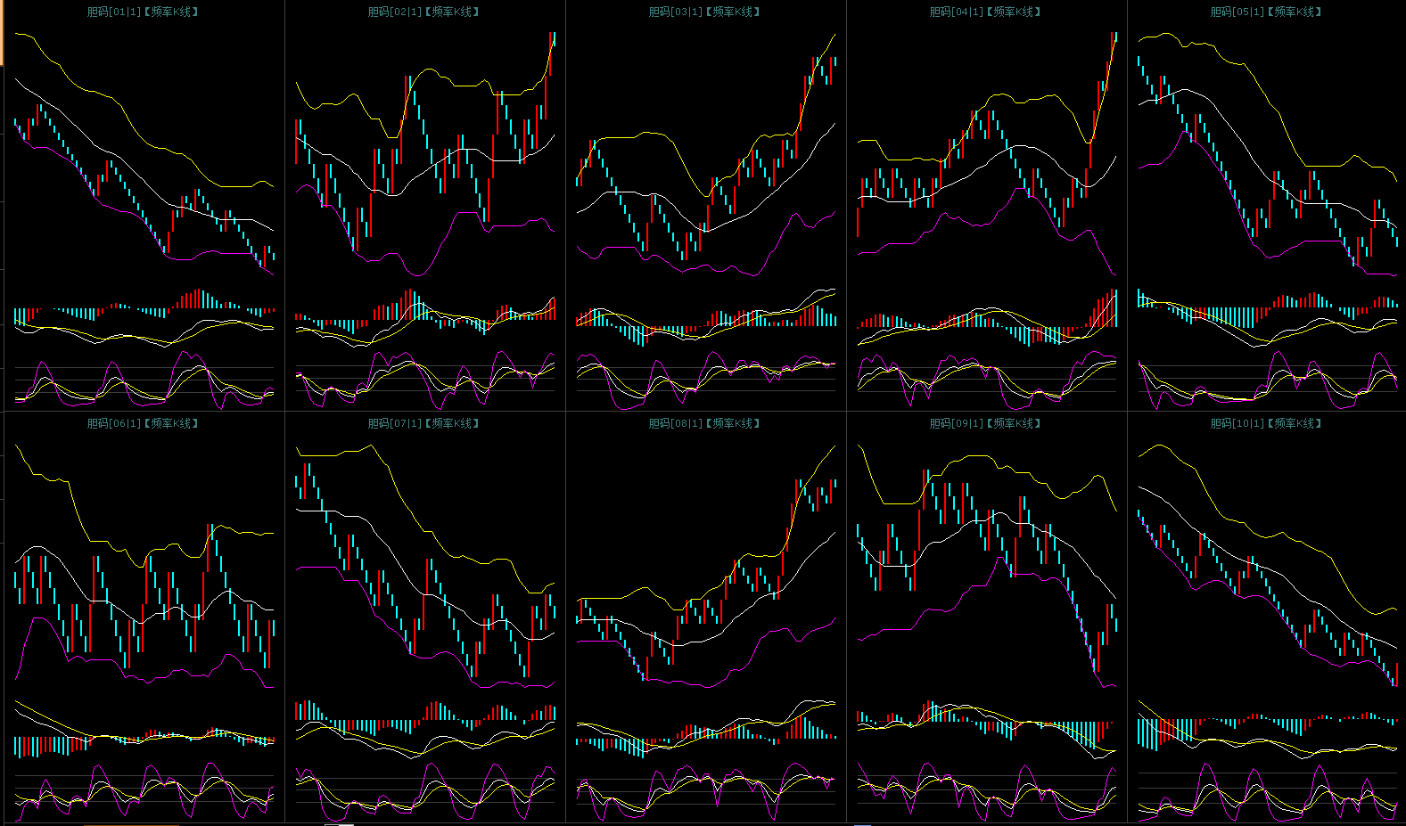 上图是01-10这十个号码的同屏K线图,图中显示目前走上升趋势的是胆02 03 04 07 08 09,其中看了下对码胆情况,对码2和对码4上升趋势中,继续上攻的概率较大。所以胆码从02 04 07 09当中去选择。综合来看,选择胆02作为主胆。