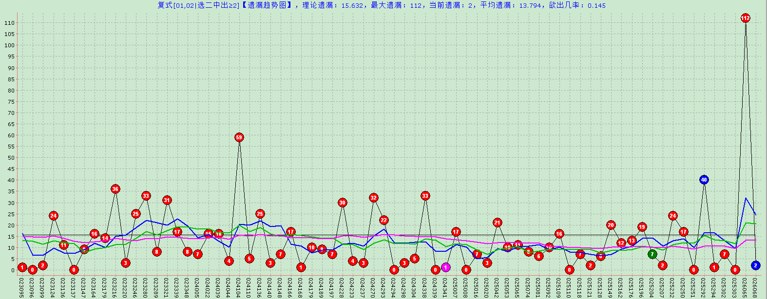上图是两码01 02组合的遗漏图,图中显示目前遗漏值是2,可以看到前期刚出现了一个超级大遗漏112,目前小遗漏回补是大概率事件。