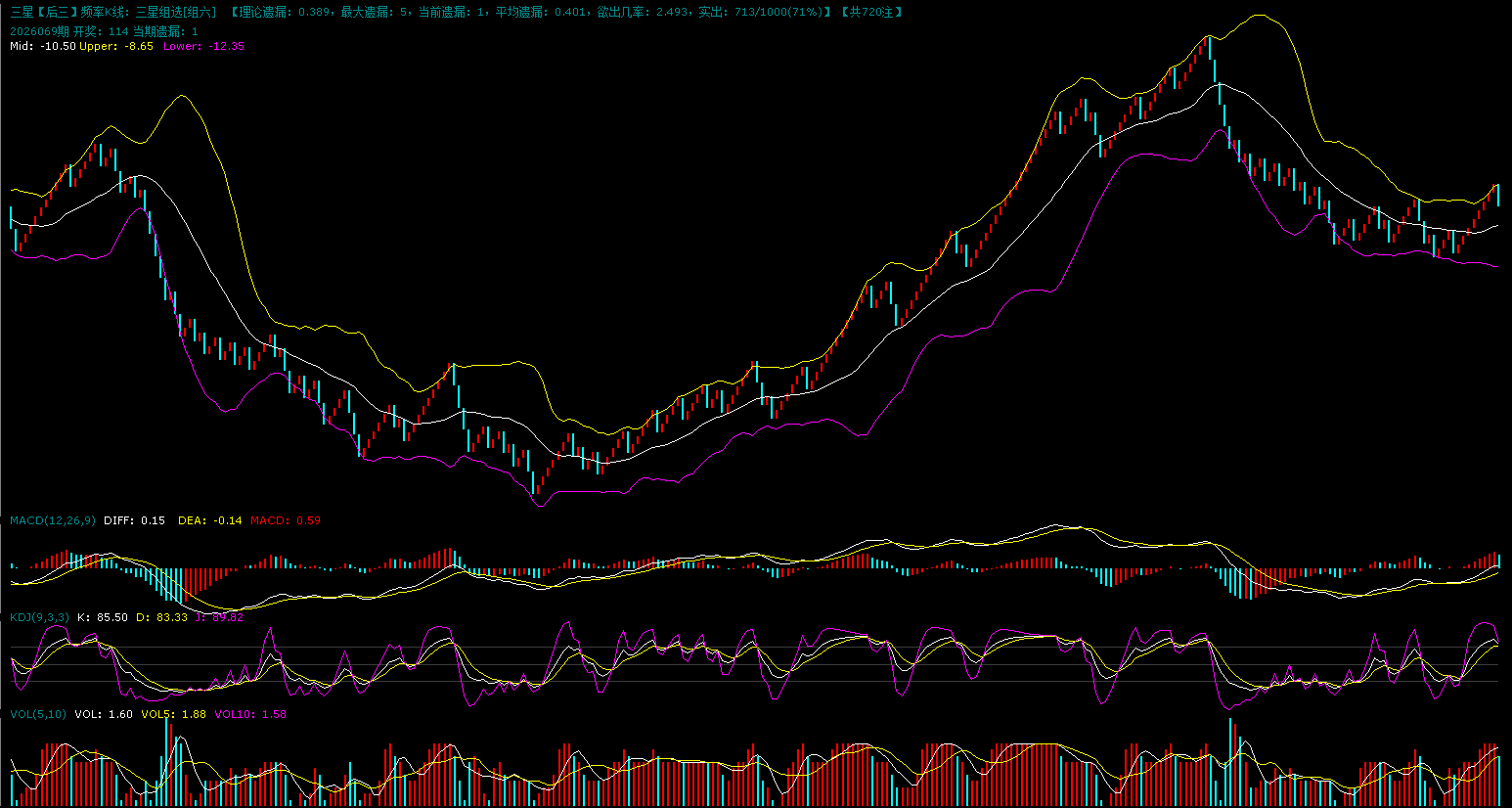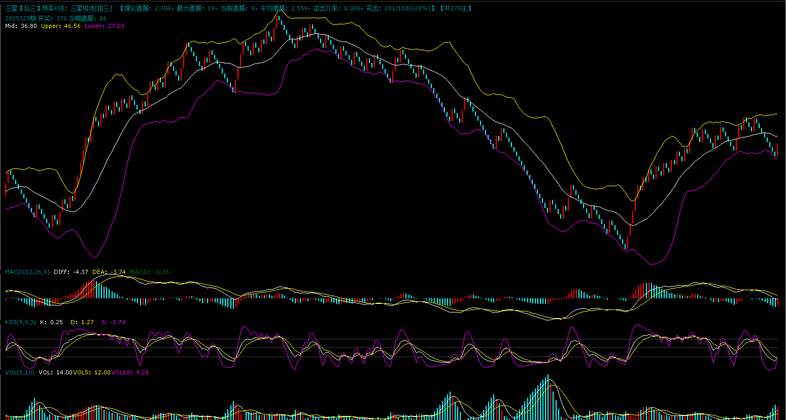上图是组三的K线图,图中显示昨天红格子开出,前期连续大遗漏回调之后昨天出现了止跌,但是K线目前还是继续处于布林中轨下方运行,上方的压力还是比较大,顶背离的形态,目前还是只能作为防守,无法确定绝杀状态。