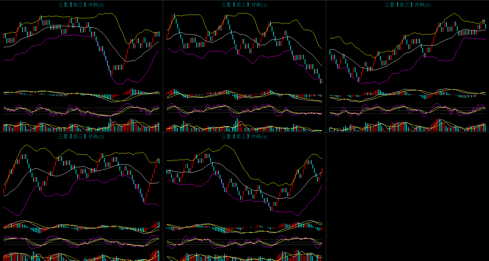 上图是对码胆的同屏K线图,昨天开出了114对应的对码是114开出了对码组三形态。上图中可以看到对码0高位横盘震荡走节奏,昨天蓝格子,今天红格子概率较大。对码2还是弱势下行中,昨天虽然出现了红格子反弹,但是趋势还是没有改变。对码2连续回调,观望为主。对码3连续上攻之后昨天首次回调,暂时观望了。对码4连续上攻中,继续顺势而为。