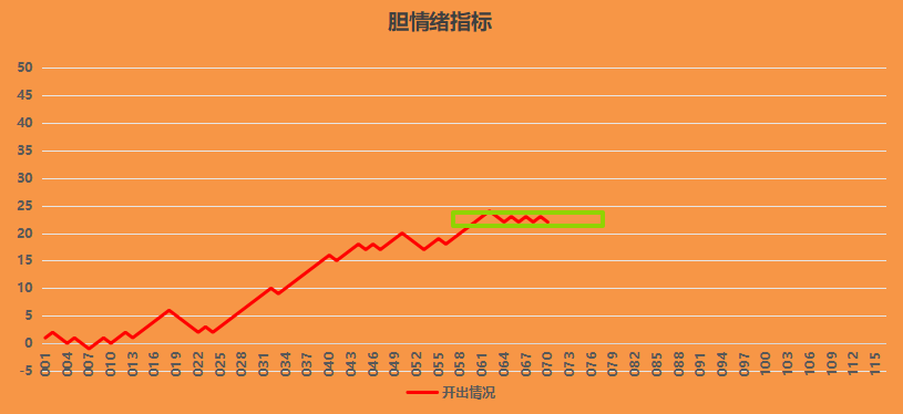 图中显示的三胆的情绪指标折线图,图中显示目前高位横盘震荡走节奏,从方框内可以看到属于窄幅震荡,基本就是一蓝一红轮流来,目前就是这个趋势,按照节奏踏对点就行。