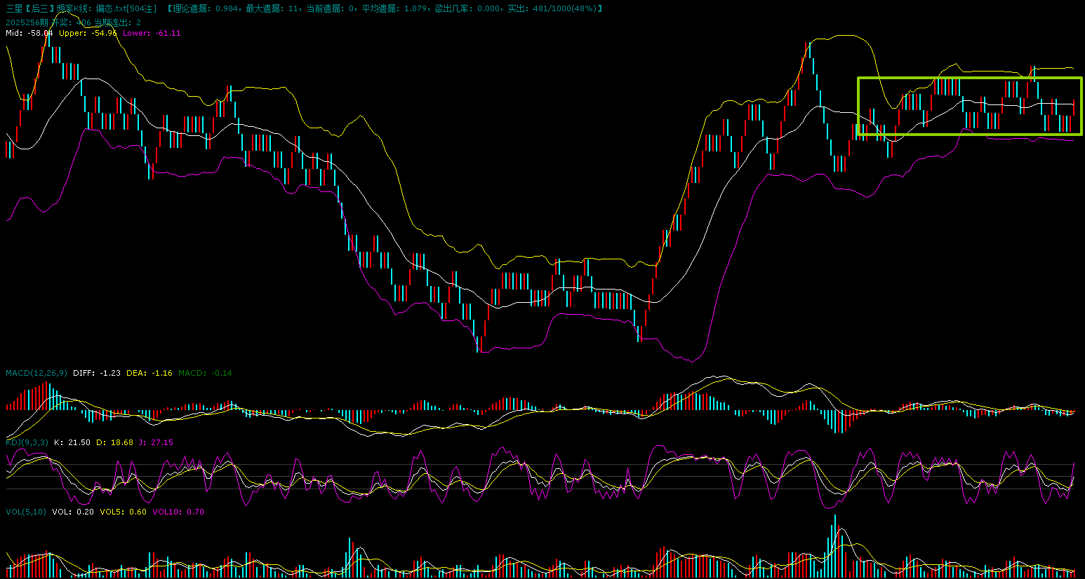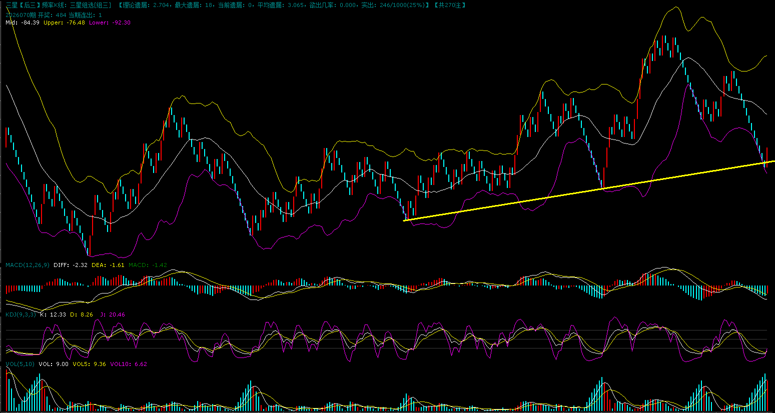 上图是组六的K线图,图中显示昨天红格子终结了13连阳的连开行情,蓝格子刚好出现在上方的压力位附近,上方压力位明显,短期蓝格子频率大于红格子。综合来看,近期组三的频率高于组六。