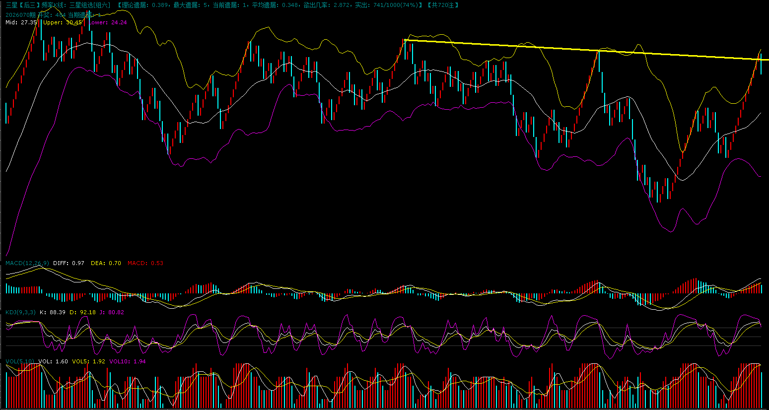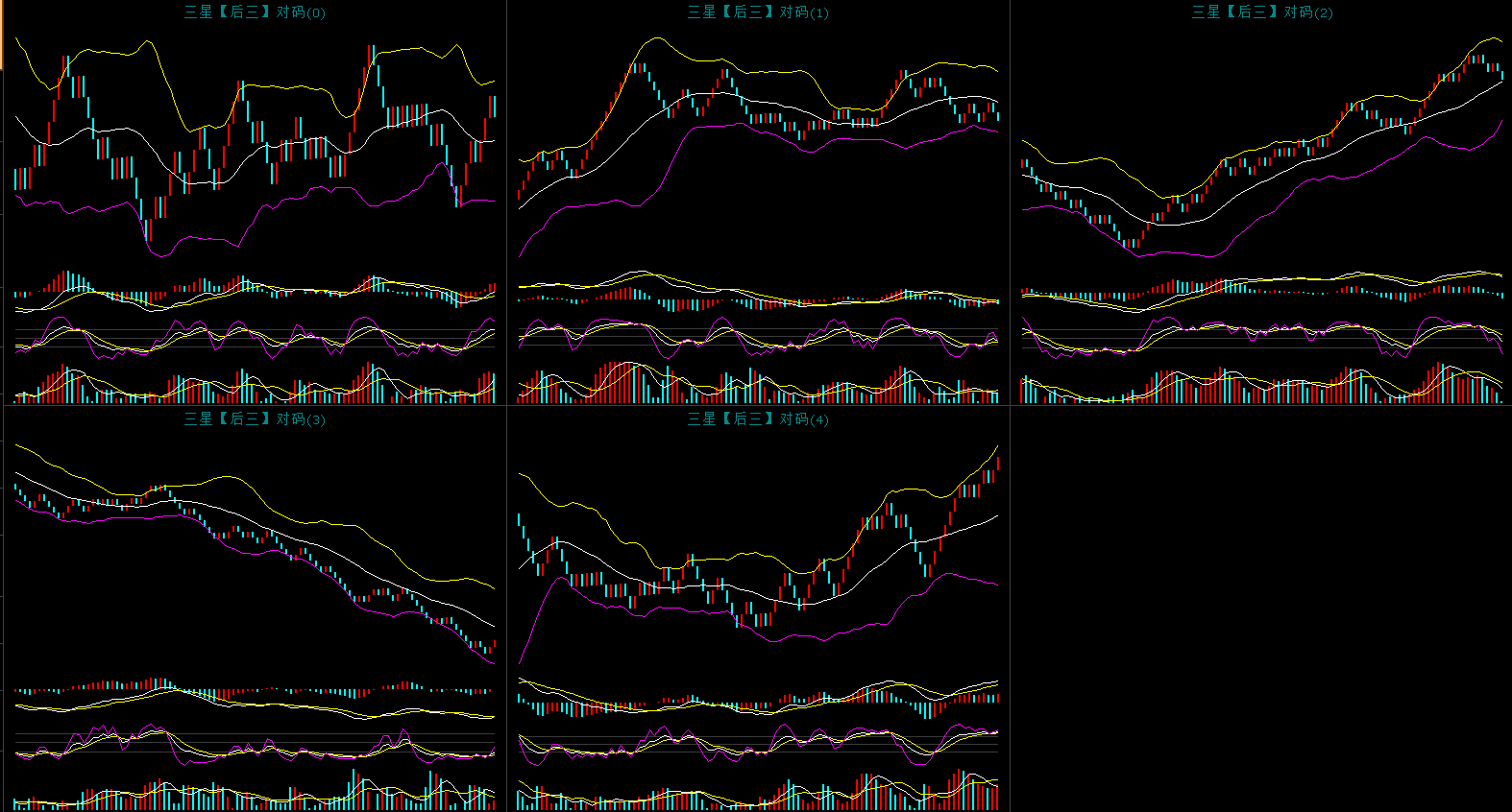 上图是对码胆的同屏图,昨天开出了484对应的对码是434开出了对码组三形态。上图中可以看到对码0还是处于反弹阶段,昨天没有出现调整,从近期的开出频率来看,红格子的频率高于蓝格子的频率。对码1弱势下行中,对码2连续回调,现在布林中轨有支撑,能够形成有效支撑还有待观察。对码3连续下跌之后出现了超跌反弹,近期红格子开出频率高于蓝格子。对码4红格子继续连开中,跟随趋势。