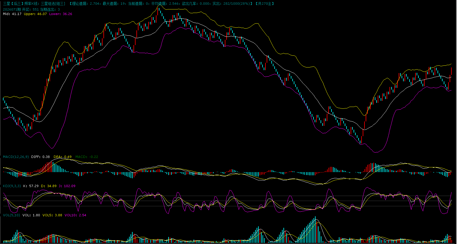 上图是组三的K线图,图中显示红格子出现了三连阳形态,kdj指标金叉,目前反弹的力度还是不错,加上偏态行情持续,组三继续延续强势行情是大概率。