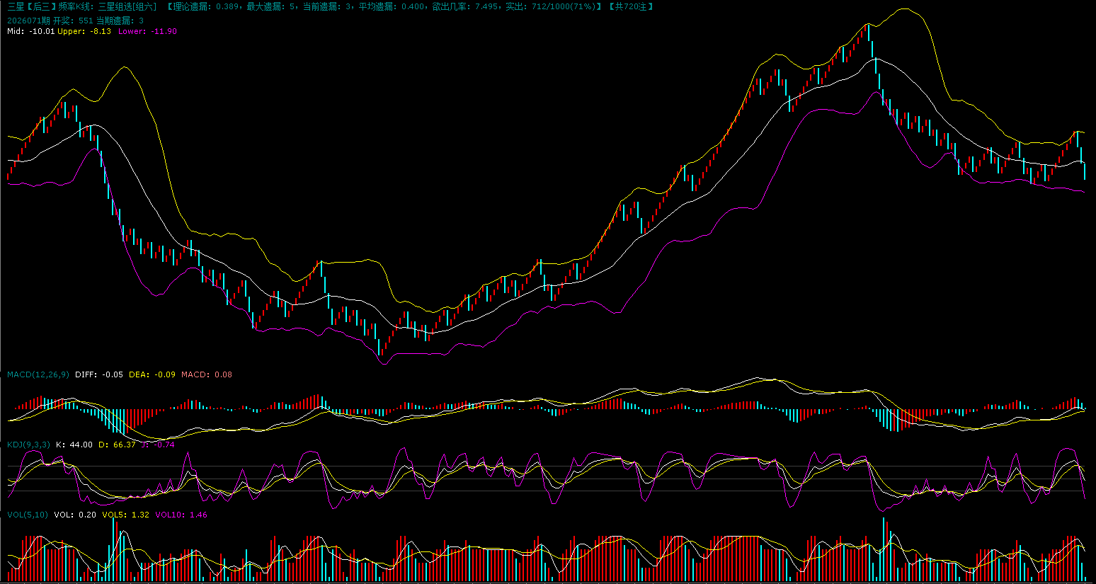 上图是组六的K线图,蓝格子昨天继续回调中,现在K线已经跌破了布林中轨的支撑,kdj死叉状态,继续下降是大概率事件。综合判断,组三为主,组六防守。