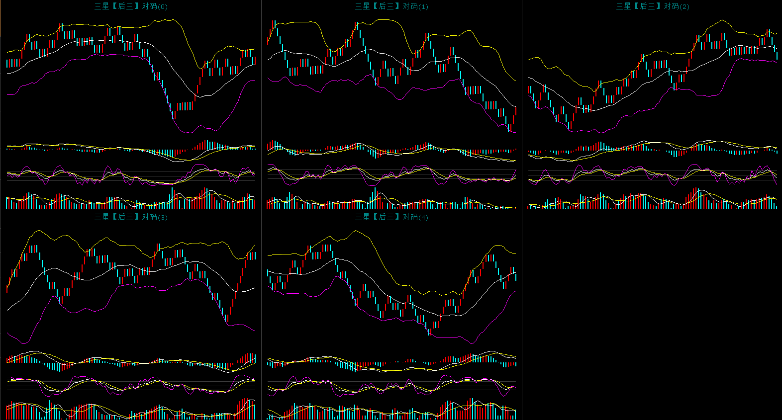 上图是对码胆的同屏K线图,昨天开出了551对应的对码是001开出了对码组三形态。上图中可以看到对码0连续回调了2个蓝格子之后回踩布林中轨开出了蓝格子,短期反弹的概率较大。对码1底部连续反弹中,继续看反弹行情。对码2连续回调,昨天跌破了箱体下沿支撑,观望为主。对码3高位横盘震荡走节奏,昨天蓝格子,今天红格子概率较大。对码4弱势跌破中轨,观望为主。