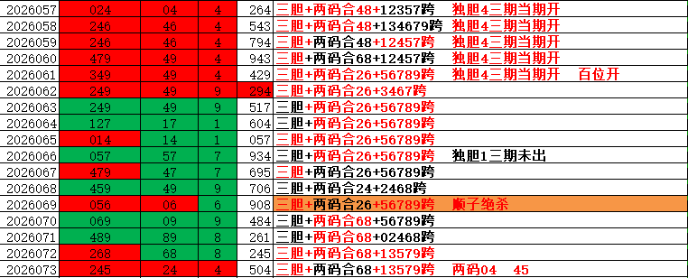 073期开出了504组六形态,目前组六出现了三连阳形态,组三大遗漏之后目前还没有回补。三胆昨天出现了连阳状态,上期胆码继续直落中,近期上期胆码直落频率还是比较高。昨天是三胆直落了两个,胆跨组合开出,两个两码同时开出。三胆出现了红格子连续反弹行情,前期的横盘走节奏趋势打破,局部红格子频率增加。