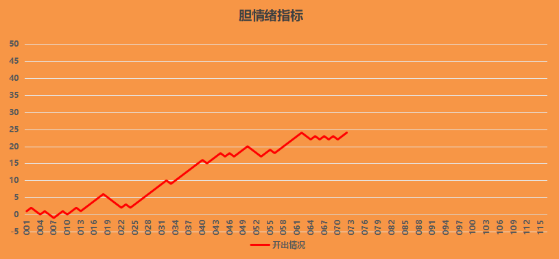 图中显示的三胆的情绪指标折线图,图中显示折线昨天出现了连续上攻,前期的横盘震荡趋势突破上行了,现在折点又来到了历史最高点压力位附近了,趋势上来看,创新高的概率较大。