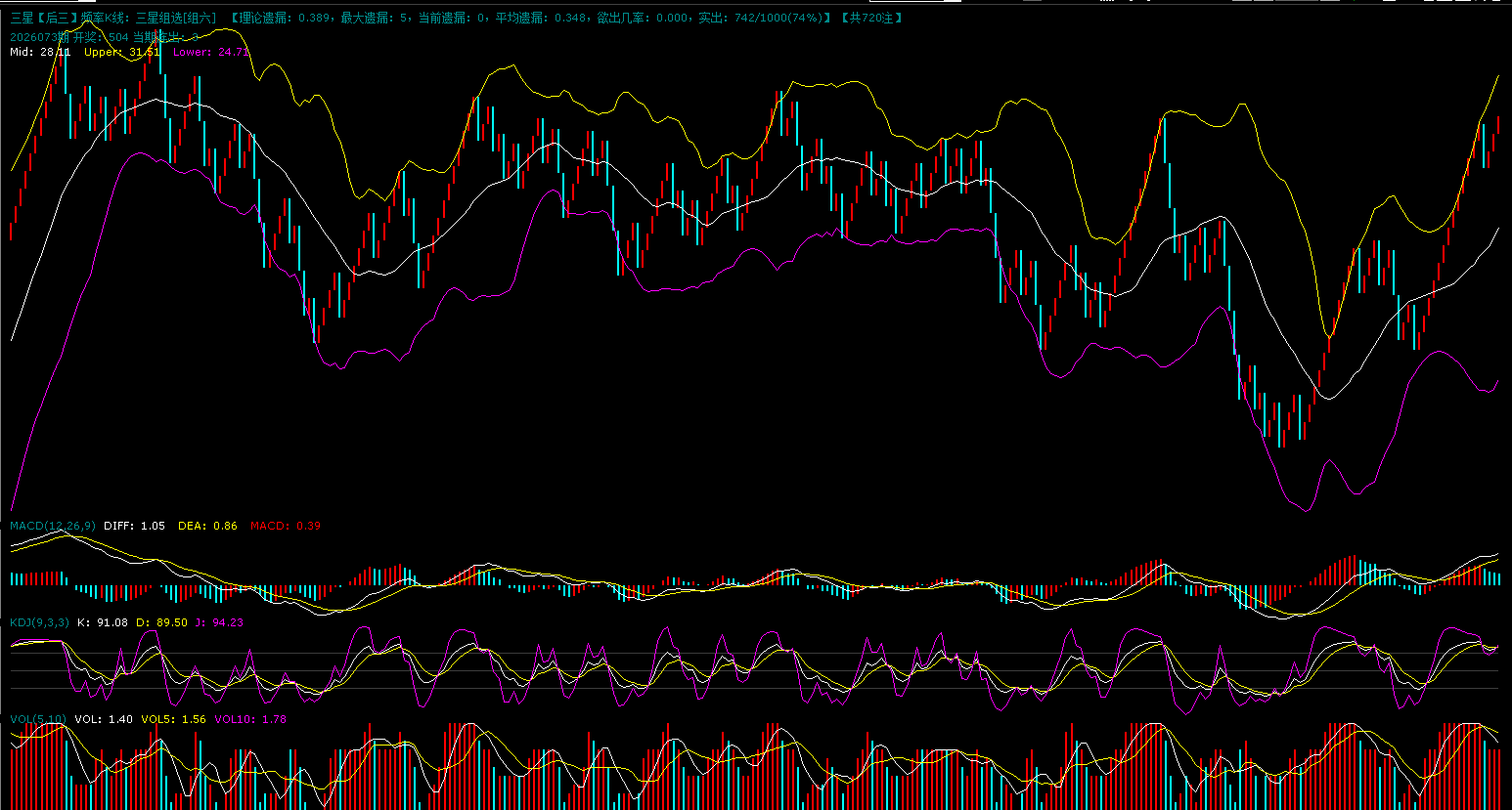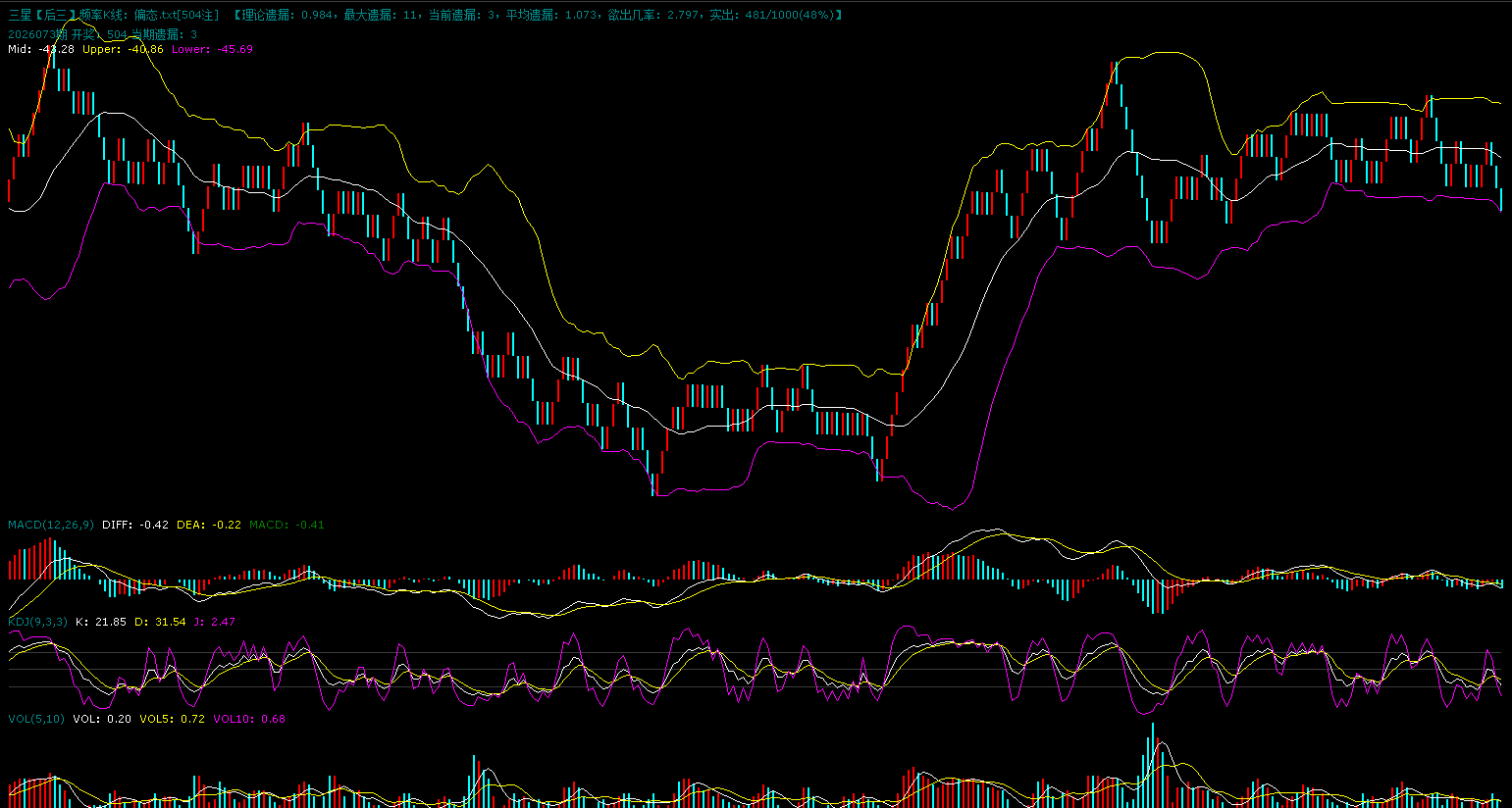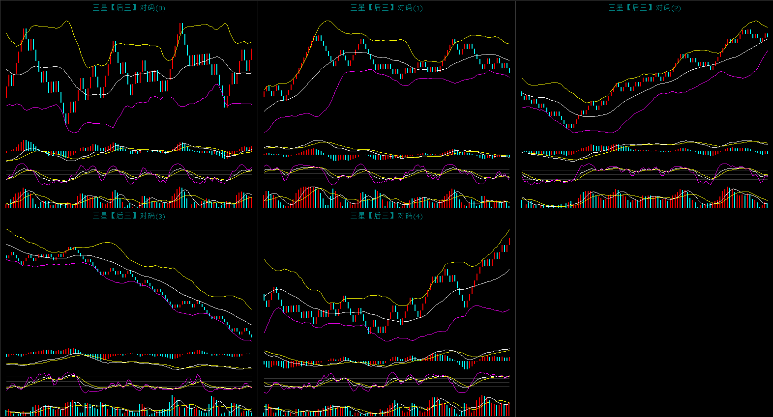 上图是对码胆的同屏图,昨天开出了504对应的对码是004开出了对码组三形态。上图中可以看到对码0回踩布林中轨之后连续反弹中,局部红格子频率高于蓝格子。对码1弱势下行中。对码2高位震荡,观望为主。对码3还是继续弱势下行,没有止跌迹象。对码4上升趋势延续。