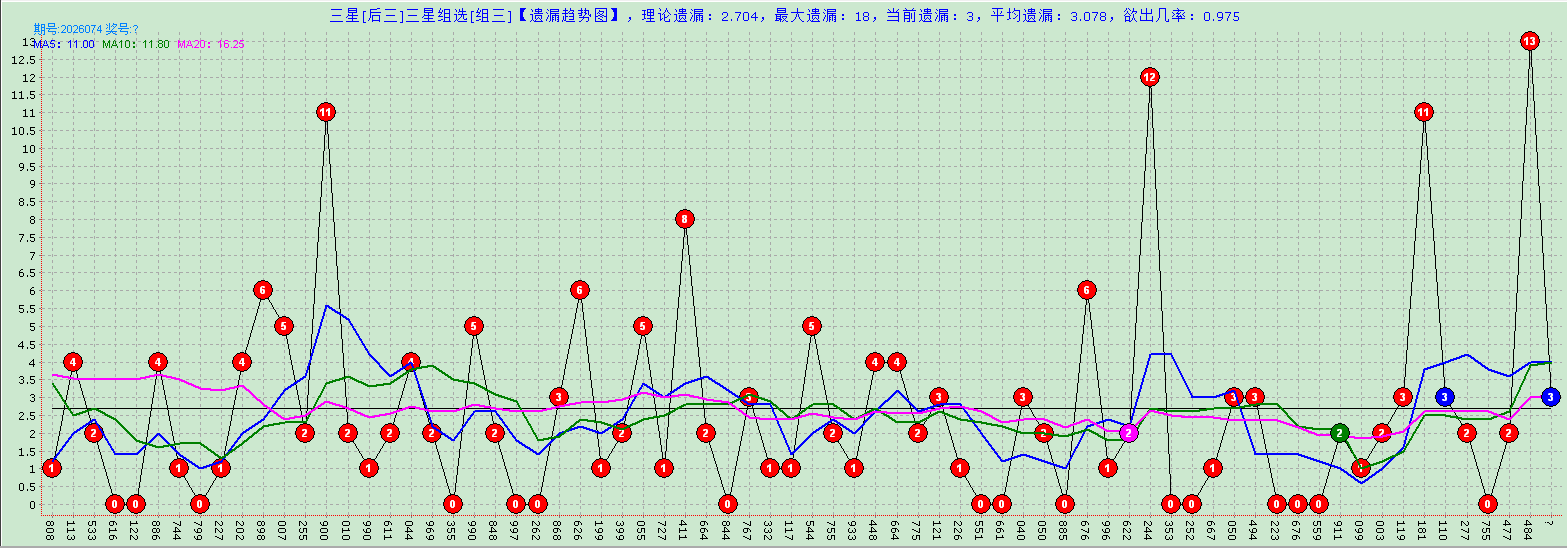 上图是组三的遗漏图,图中显示目前遗漏值是3,昨天遗漏2这个点没有出来,落点上来看,遗漏2和遗漏3这两个点近期开出的频率比较高,现在就剩下遗漏3这一个落点了。