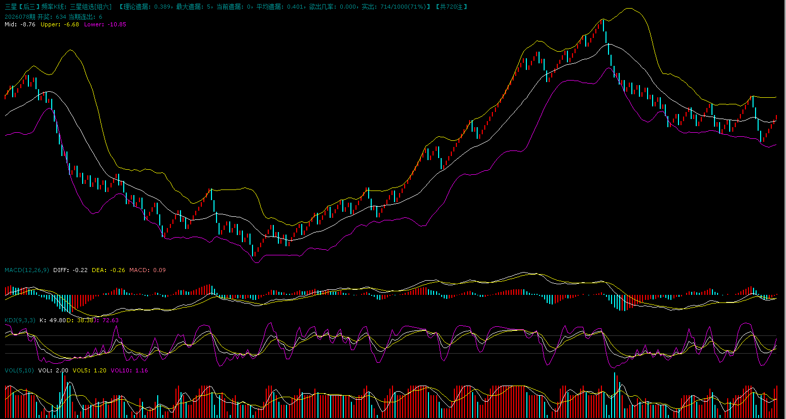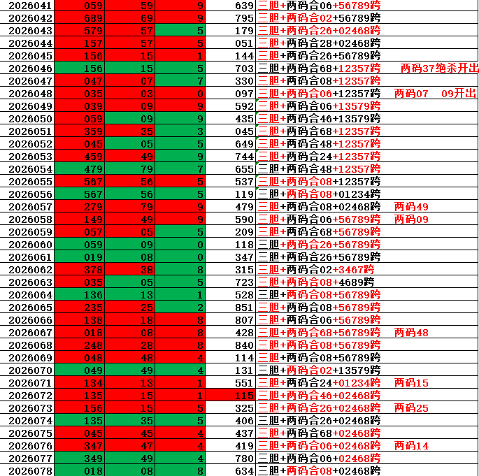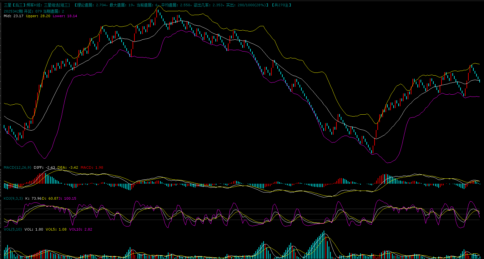 上图是组六的K线图,图中显示红格子持续反弹中,目前K线已经站上了布林中轨继续反弹,趋势良好,继续顺势而为。综合判断,组六为主,组三防守。其中组六半顺的频率高于杂六和顺子的频率。