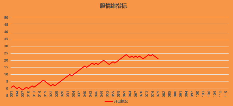 图中显示的三胆的情绪指标折线图,图中显示前期高位横盘震荡中,昨天出现了蓝格子连开,前期的箱体下沿支撑破位,趋势开始变成下行趋势。