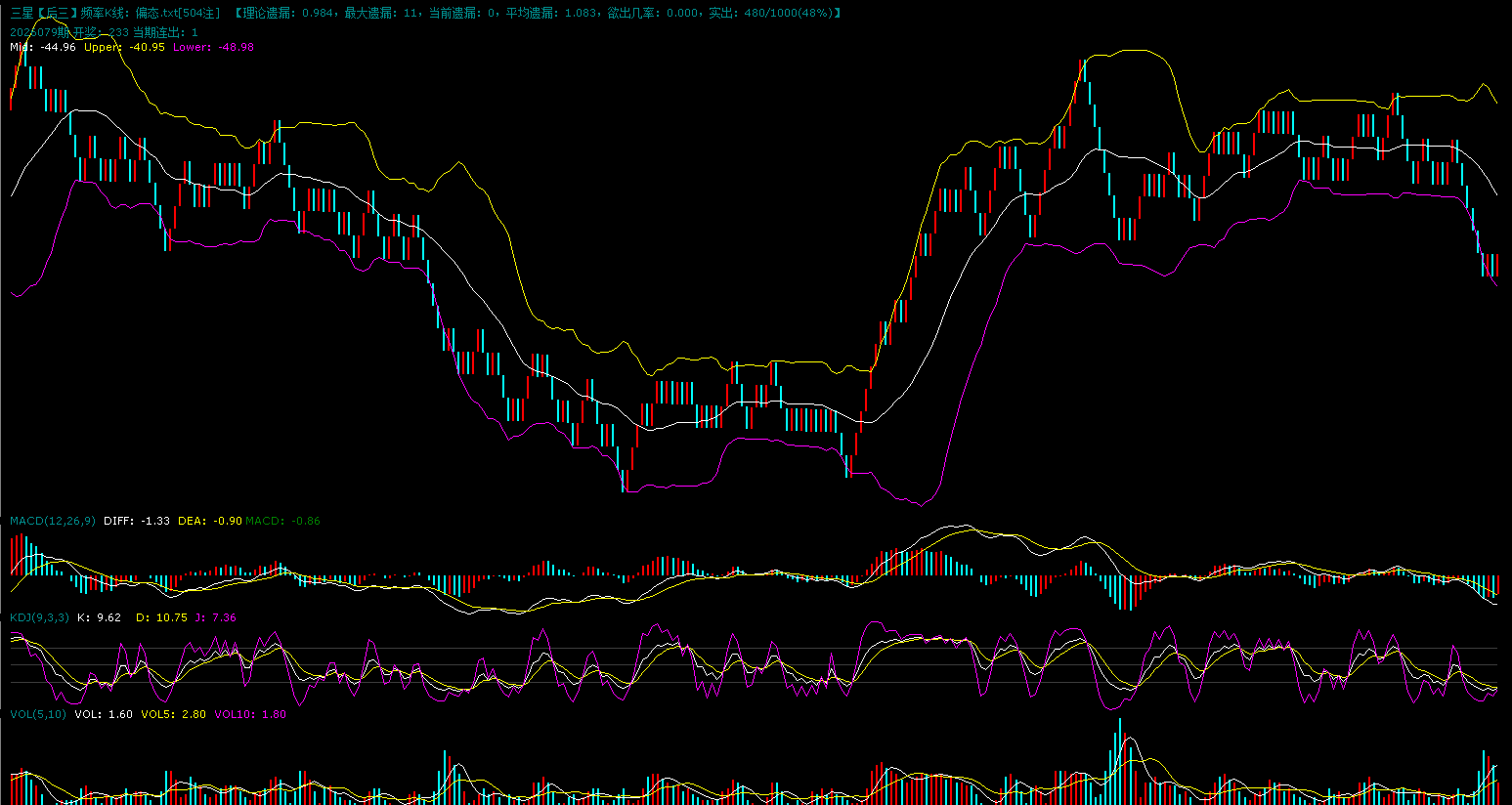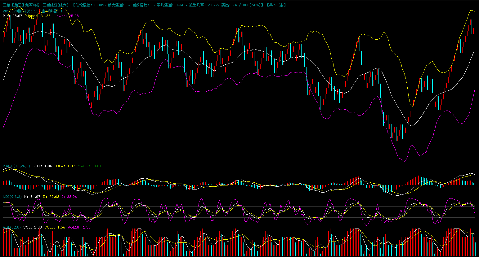 上图是组六的K线图,组六趋势刚好与组三趋势相反,高位出现调整之后蓝格子频率明显增加,macd指标死叉,kdj指标死叉,K线离下方的支撑还有下行空间。综合来看,组六蓝格子频率高于红格子。
