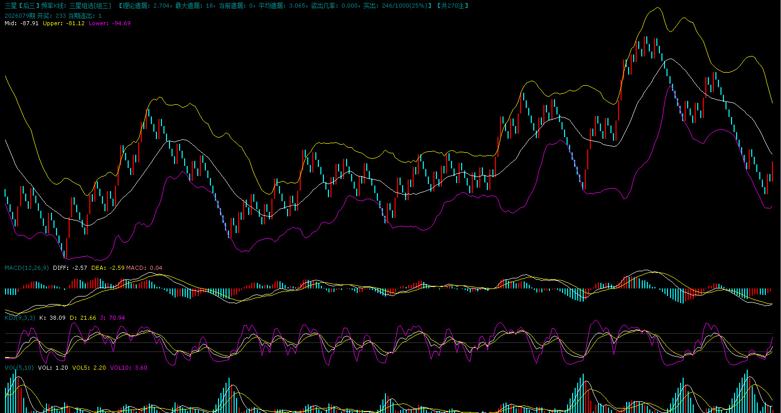 079期开出了233全小组三形态,组三大遗漏开出。昨天三胆出现了三连阴,目前已经创造了近期统计的历史记录,局部来看是顶部结构出现,这个阶段风险高于利润。三种趋势,上升趋势跟随,震荡趋势走节奏,下降趋势规避。组三连续两个大遗漏之后目前周期K线出现了止跌反弹,短期是一个底部反弹的阶段。