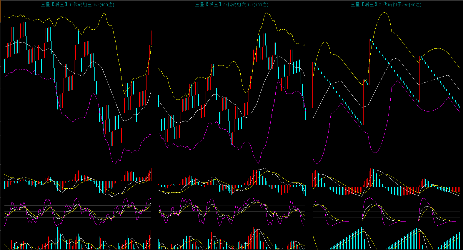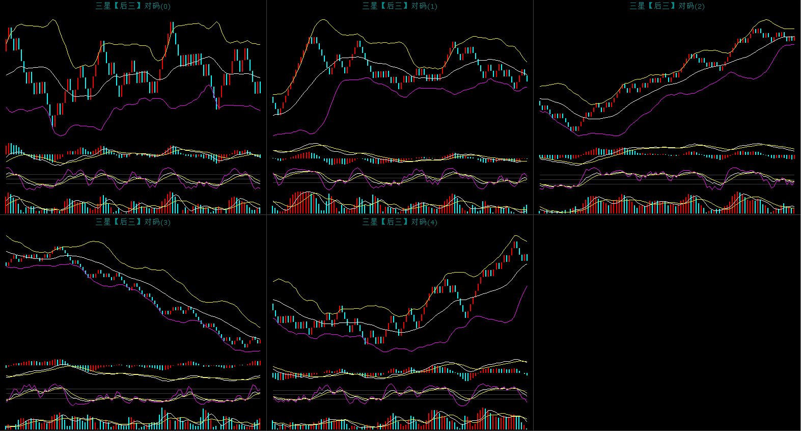 上图是对码胆的同屏图,昨天开出了233对应的对码是233开出了对码组三形态。上图中可以看到对码0弱势调整中,今天蓝格子频率高于红格子频率。对码1上攻乏力,布林中轨没有突破上去遇阻回落。对码2还是高位震荡中,对码3头肩底形态还没有完全形成,现在是右肩形态,颈线位突破是大概率。对码4高位震荡,K线还是处于中轨上方运行。