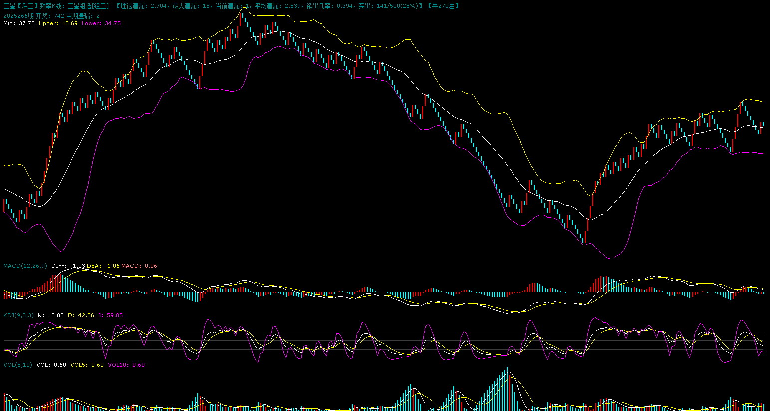 上图是组六的K线图,图中显示蓝格子回踩中轨之后没有继续下探,昨天红格子反弹,K线还是继续在布林中轨上方运行,从今天的走势来看,组三组六当期的落点不好判断。周期上来看,还是继续看组三的0-2周期反弹。