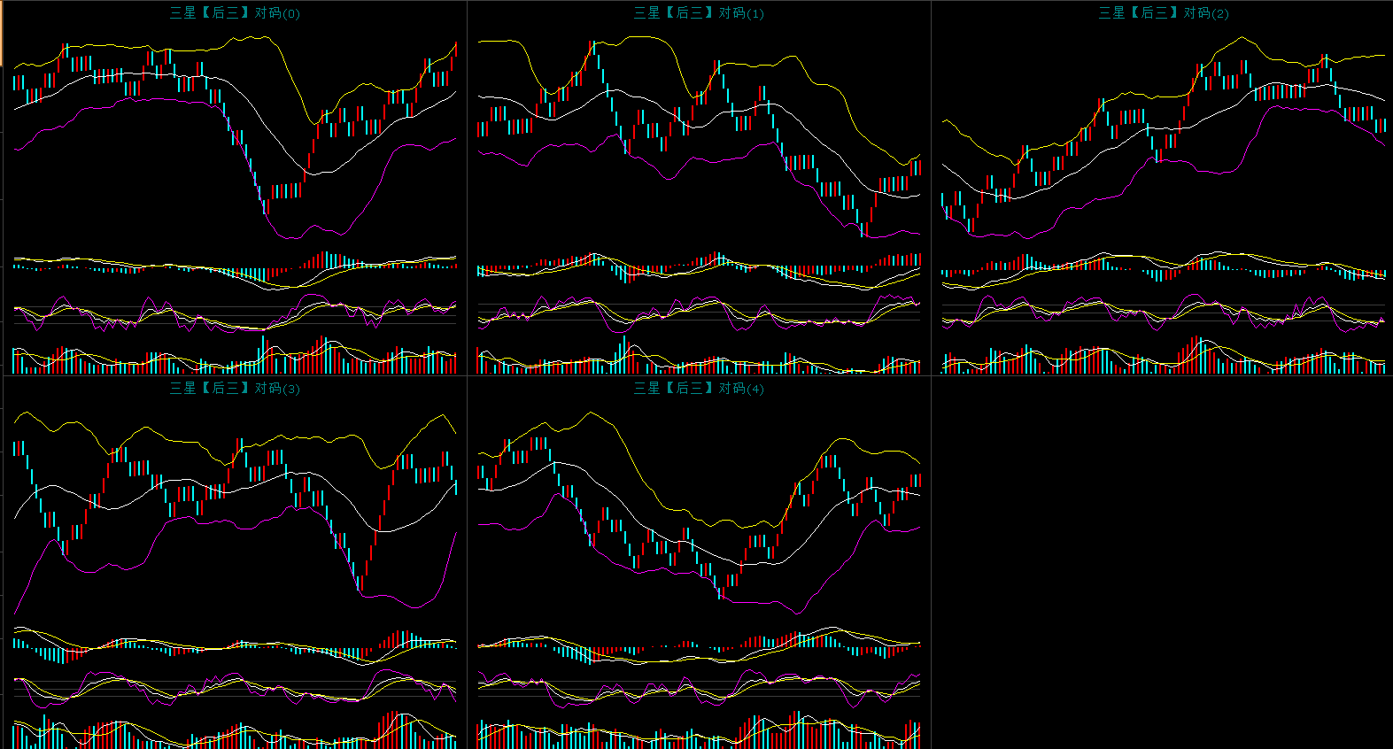 上图是对码胆的同屏K线图,昨天开出了690对应的对面是140开出了对面组六形态。上图中可以看到对面0继续连开中,目前没有顶部信号继续顺势而为。对码1还是处于反弹阶段,继续看反弹行情。对码2弱势调整,观望为主。对码3破位下行,观望为主。对码4震荡上行中,红格子概率较大,可以作为防守。