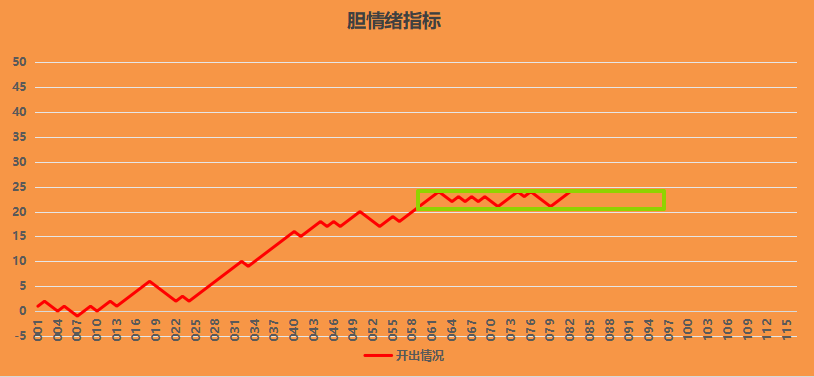 图中显示的三胆的情绪指标折线图,可以看到昨天红格子开出后现在折线来到了历史高点压力位了,这个位置是近期箱体的上沿,如果今天继续看出红格子,那么箱体压力位突破,如果开出蓝格子,短期还是在箱体内震荡。