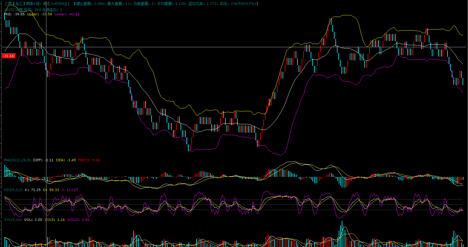 上图是组三的K线图,图中显示组三二次反弹要比第一次的力度大,但是反弹到布林中轨下方就动力不足了,接着遇阻回落,现在连续回落了3个蓝格子,现在进入到了二次探底阶段。