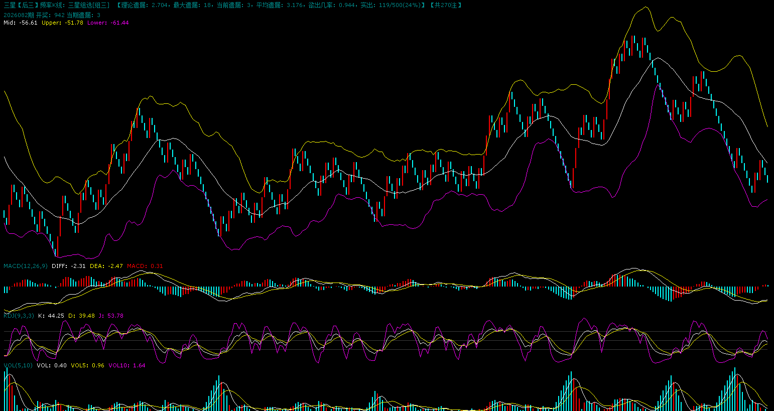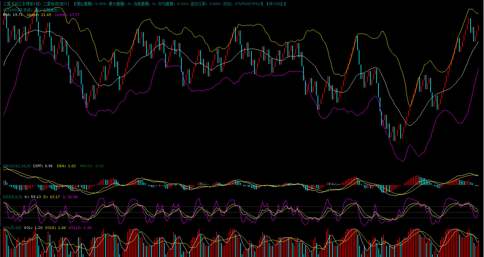 上图是组六的K线图,组六红格子继续连开中。上升趋势延续,之前高位出现了回调,回调到布林中轨附近就形成了有效支撑接着继续反弹,指标之间不是很协调。目前组六还是继续走上升趋势,组三继续走下行趋势。