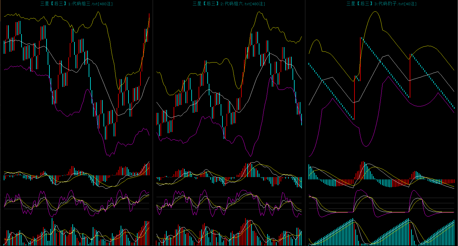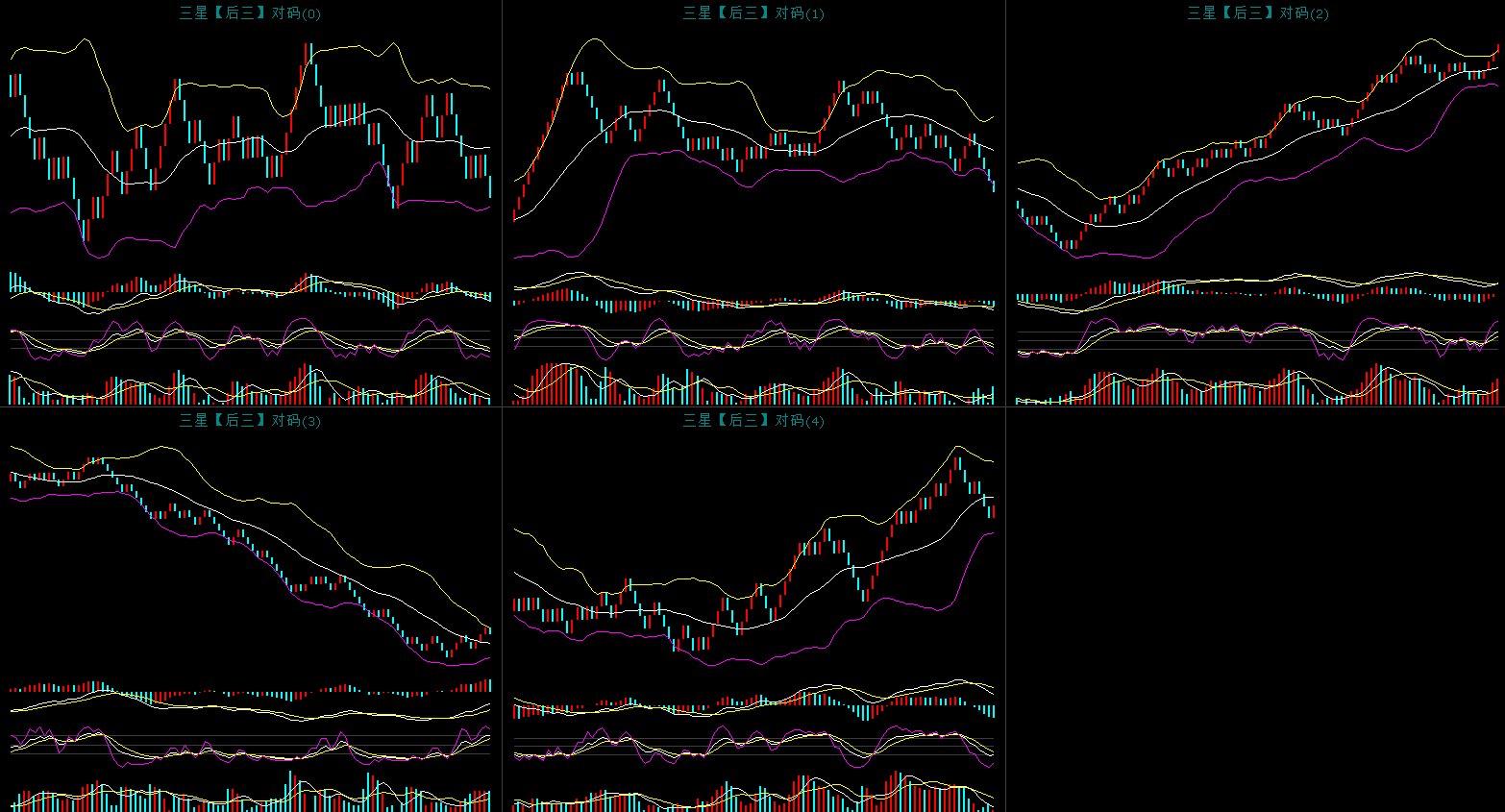 上图是对码胆的同屏图,昨天开出了942对应的对码是442开出了对码组三形态。上图中可以看到对码0继续弱势下行中。对码1连续下行。对码2上升趋势延续。对码3反弹到布林上轨小调整,头肩底形态已经形成,现在调整属于二次回踩。对码4还是弱势调整。